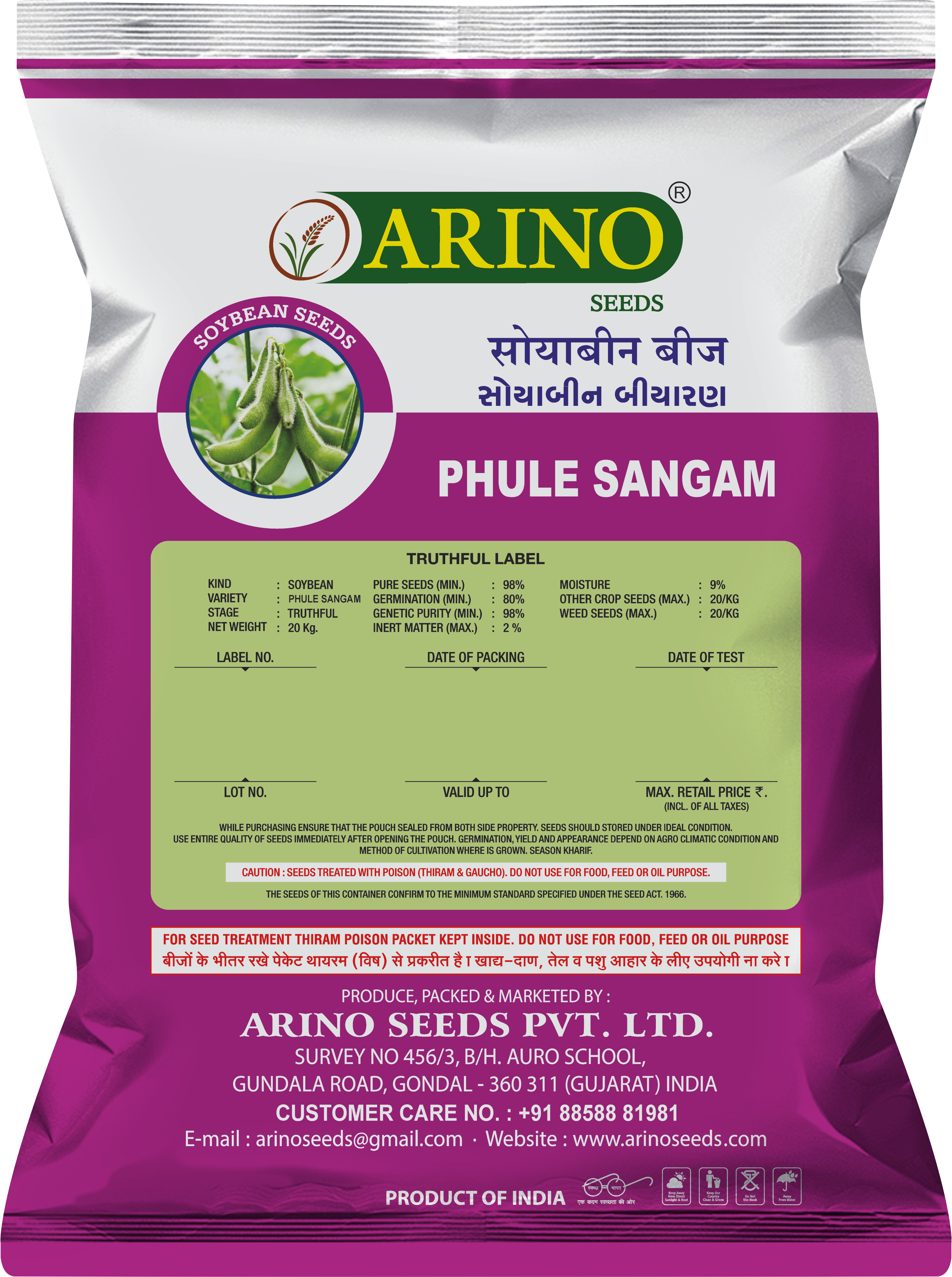 Phule Sangam is an early-maturing soybean variety that matures in 100–105 days. It is a semi-determinate, medium-height plant with yellow seeds of medium to bold size (100-seed weight 11–13 g). The variety offers a yield potential of 960–1200 kg/acre, is resistant to rust diseases, and tolerant to lodging. Its early maturity makes it suitable for timely sowing of Rabi crops after soybean harvest. Note: Phule Sangam soybean variety is available in **20 kg packing**